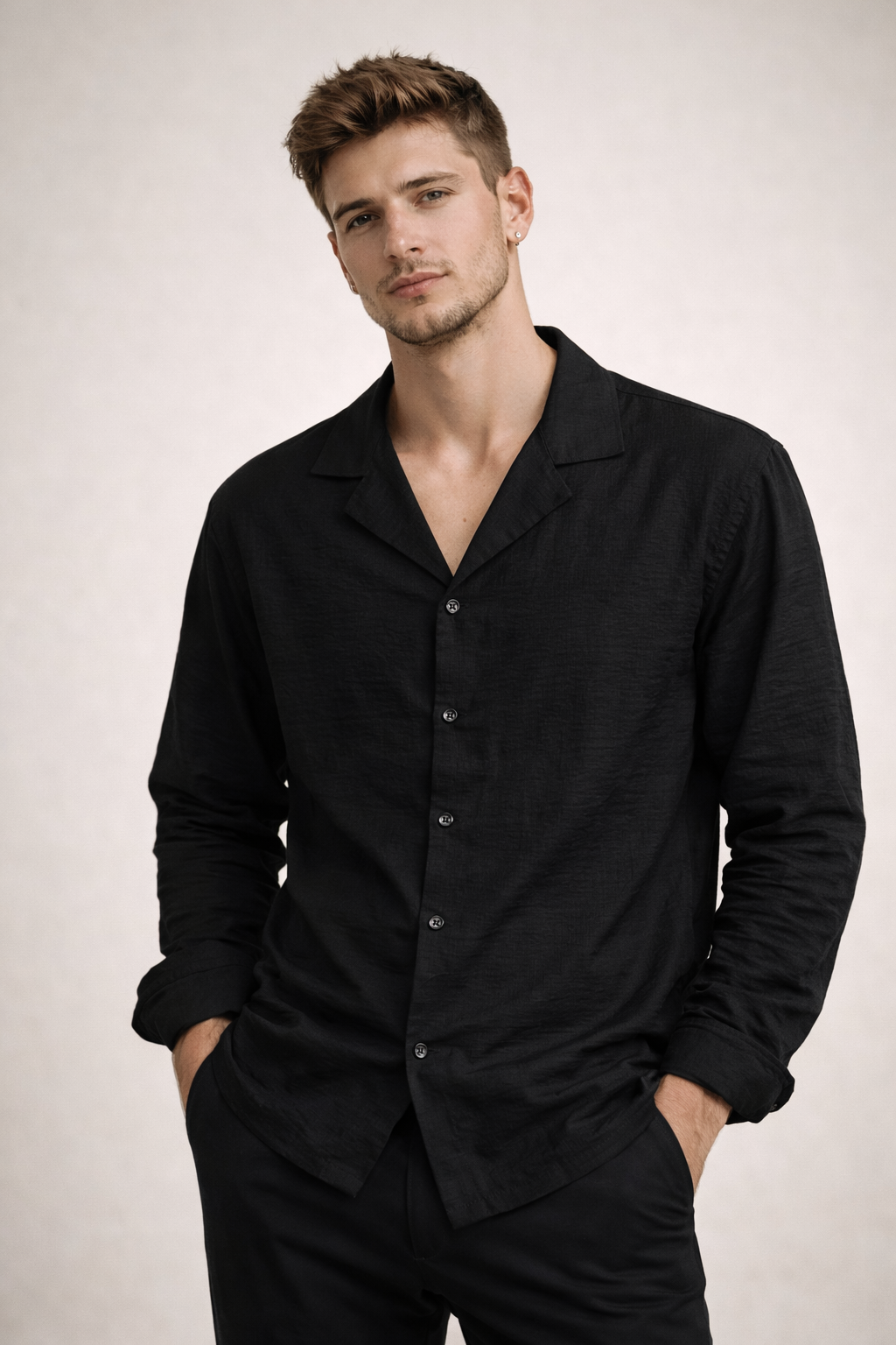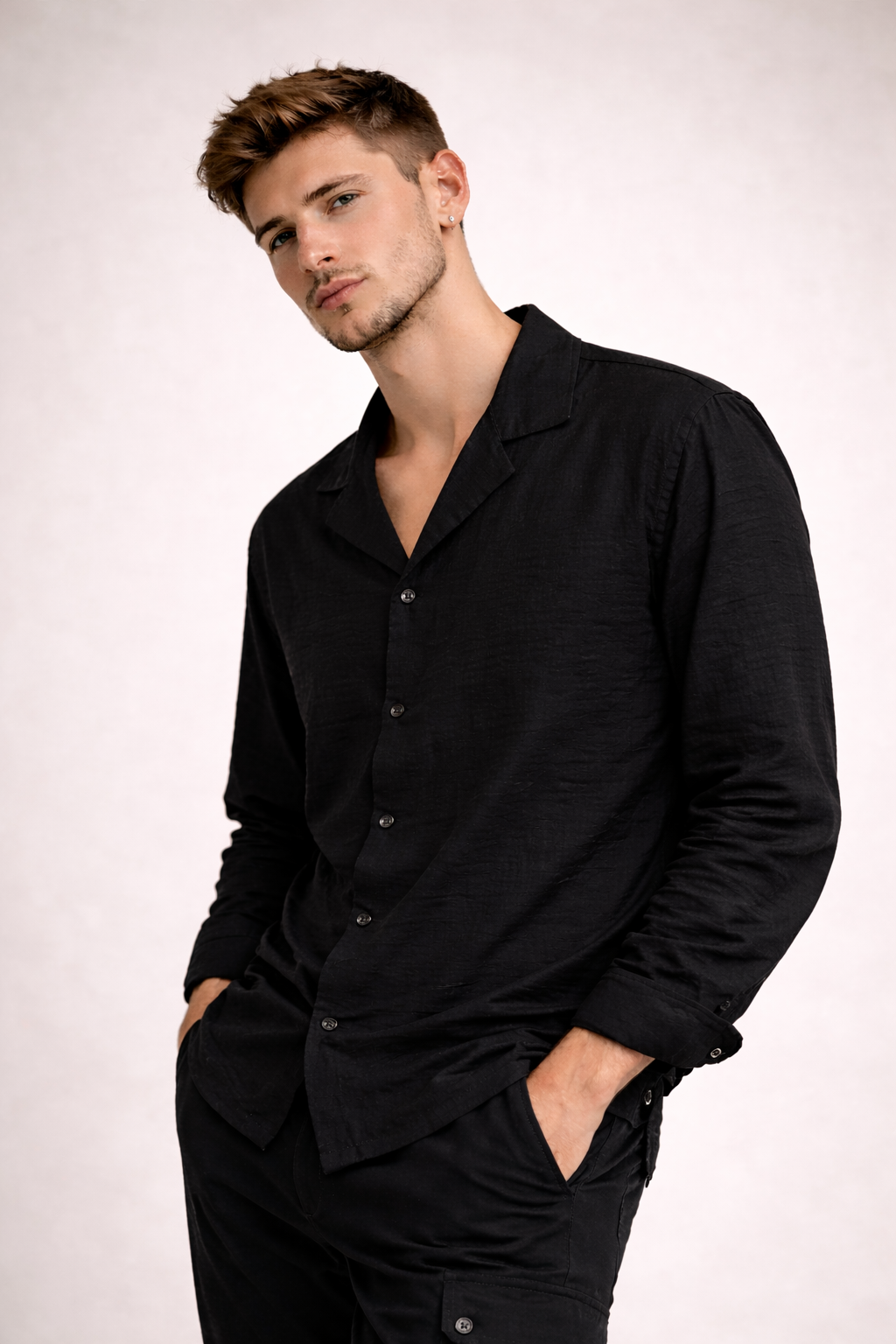 חולצת מיקונוס שחורה בגזרה משוחררת עם צווארון פתוח.