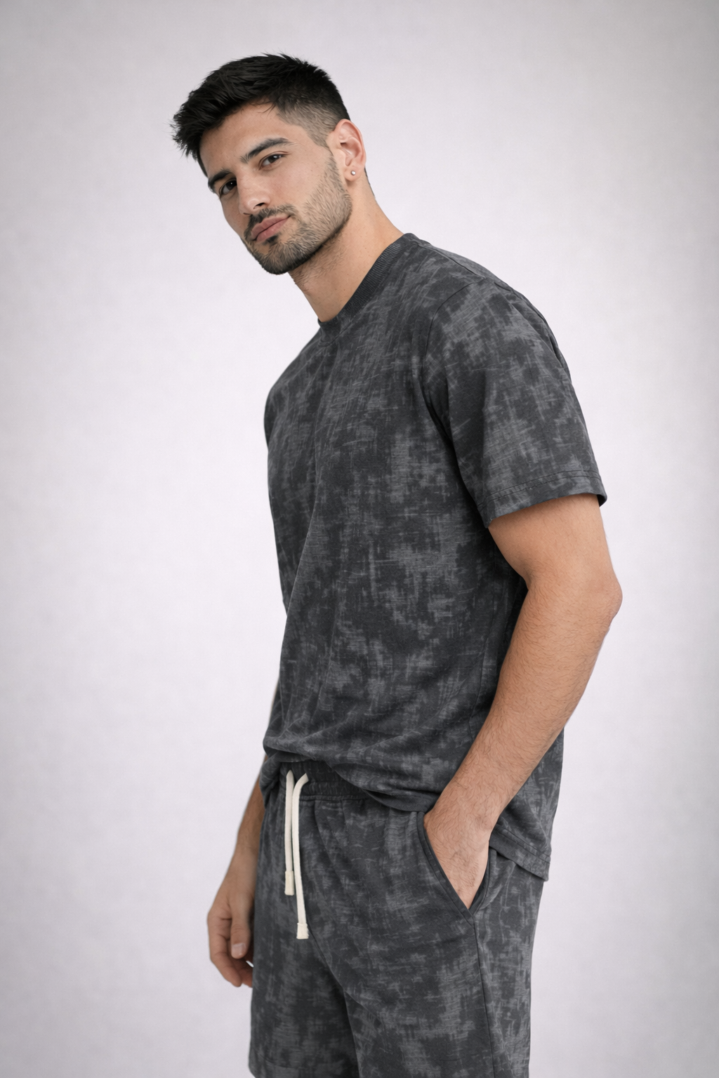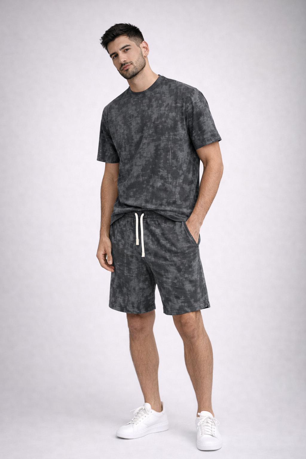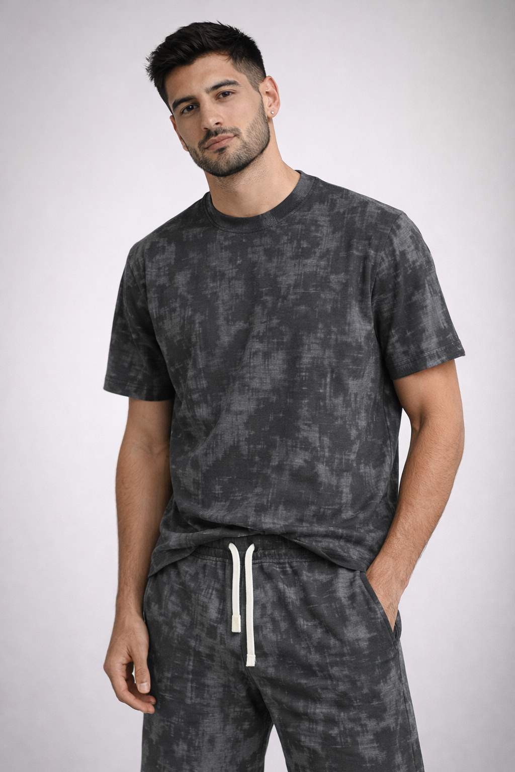 הסט כולל טי-שירט בגזרה נינוחה ושורט תואם עם גומי ושרוך קשירה לנוחות מקסימלית.